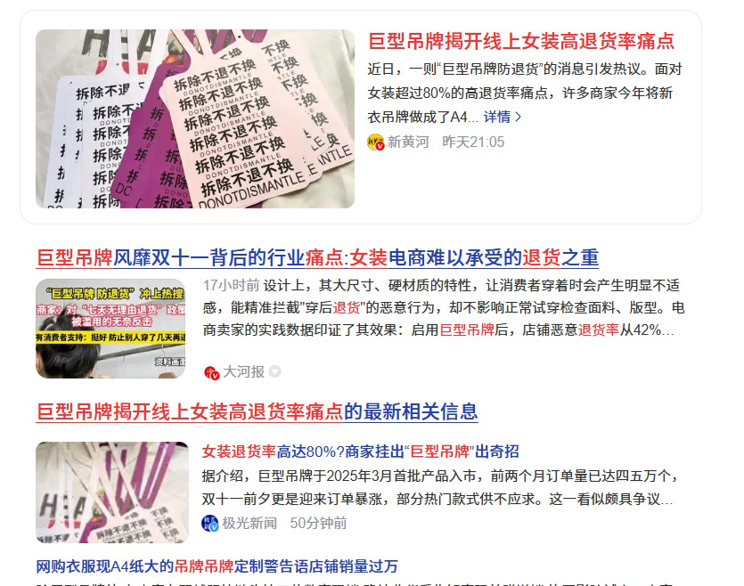 《羊城晚报》曾做过统计,启用巨型吊牌后,线上店铺恶意退货率从42%大幅降至18%。