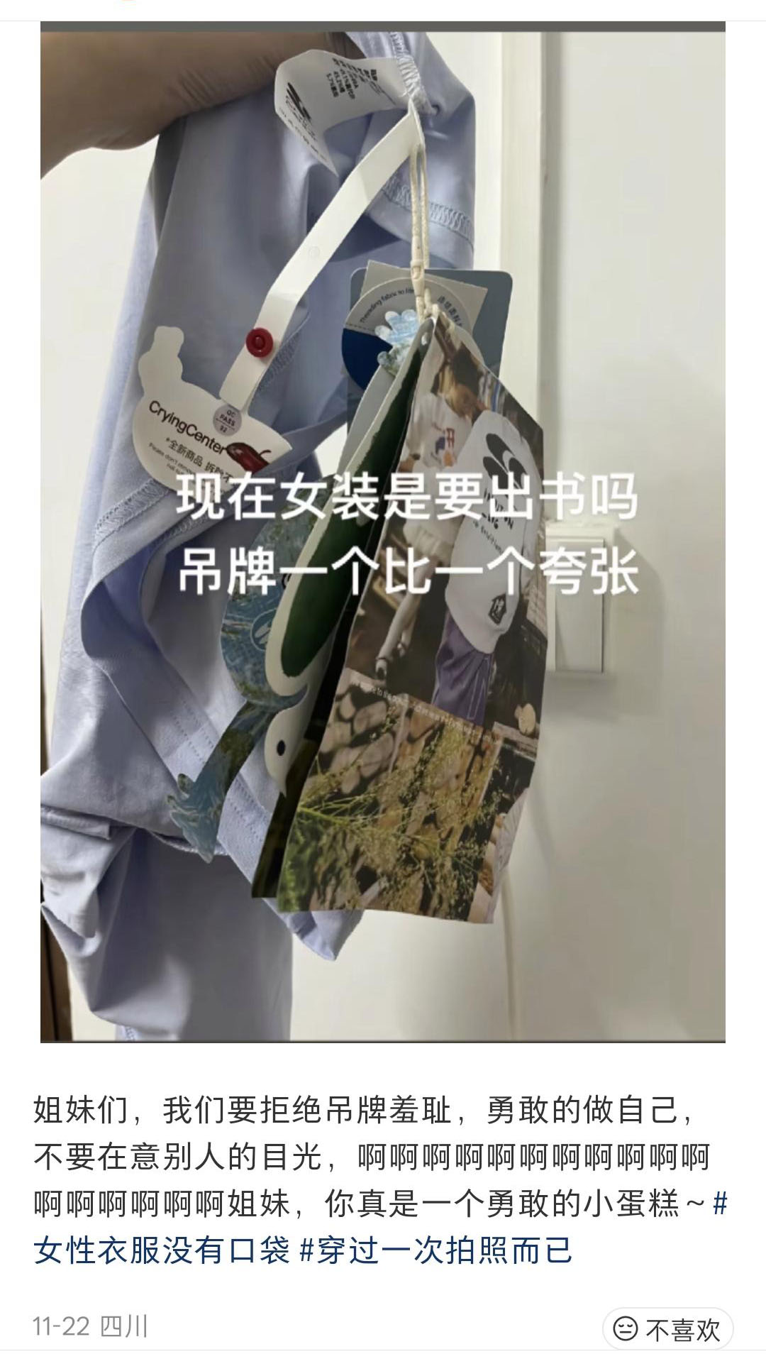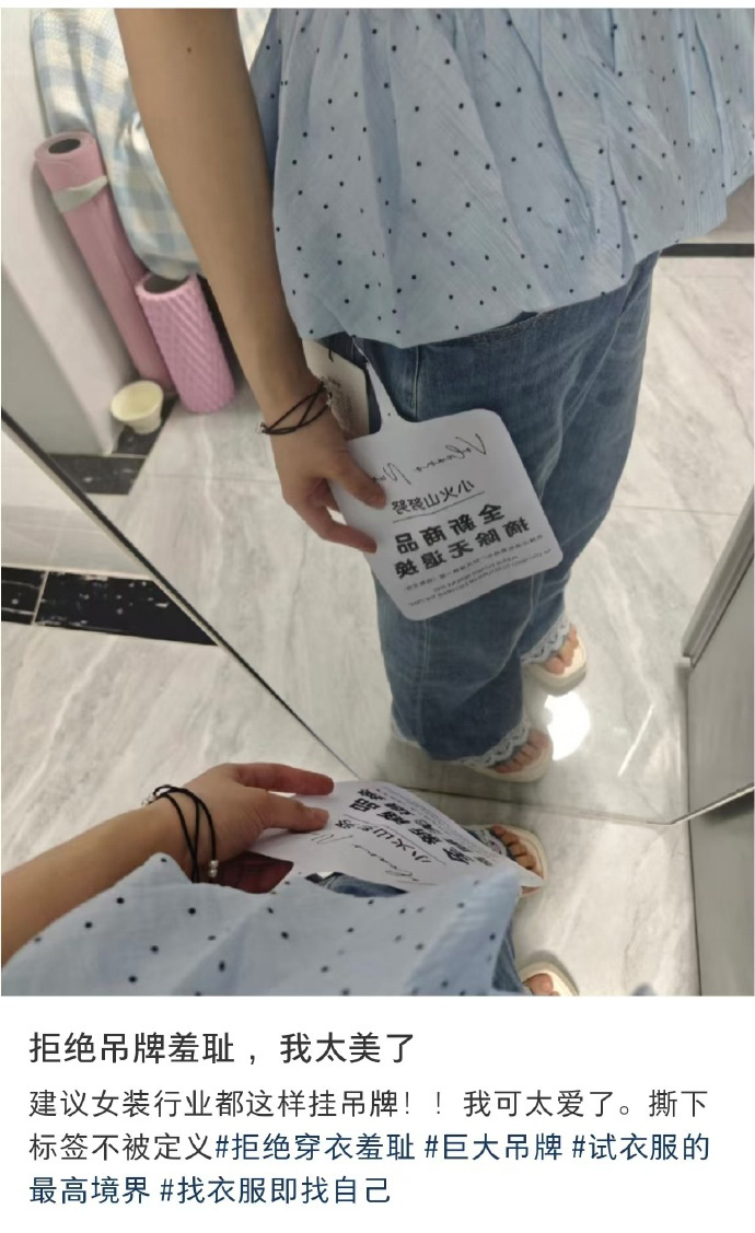 不知何时,女装的吊牌已经开始刮起了“越做越大”的风,有的大到能当餐垫,硬到能防身。有消费者调侃:“以前买衣服看款式,现在买衣服得先掂量一下吊牌的负重能力。”