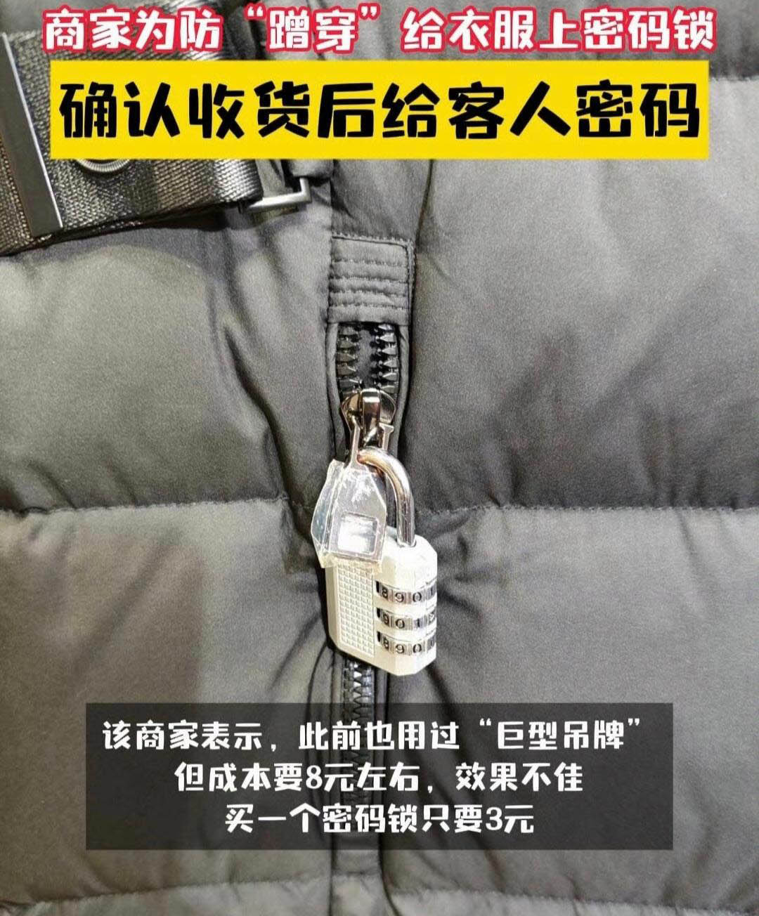 有的商家更绝,直接在拉链上挂密码锁,消费者确认收货后才会告知密码。