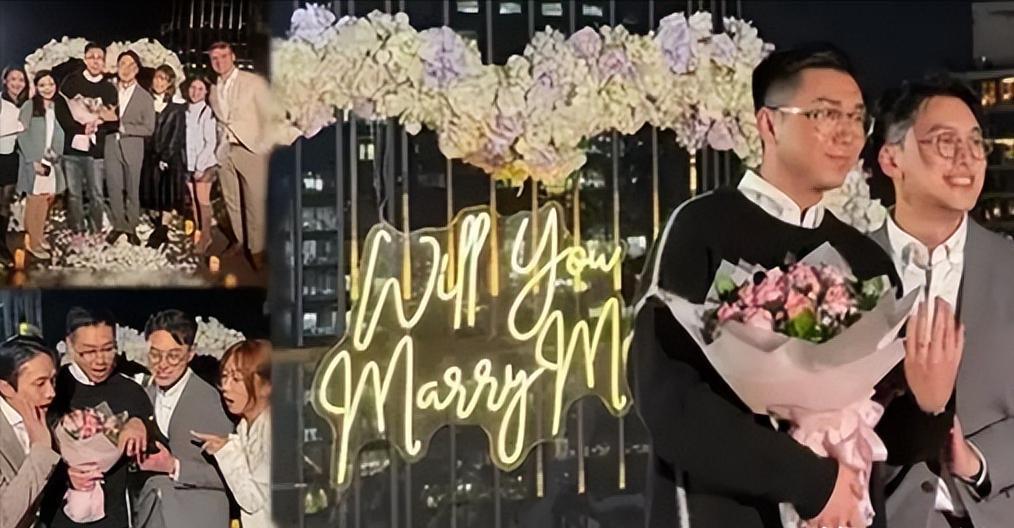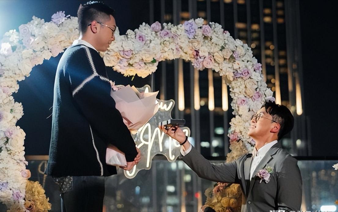 从陈书君分享的视频里能看到,Steven捧着一束玫瑰,手里攥着枚方形大钻戒,单膝跪地跟他告白。