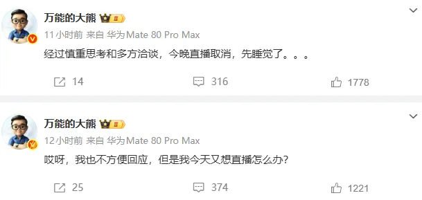 而作为“当事人”的万能的大熊,也连发多条对争议作出间接回应,比如他发文表示:这事自己不方便回应,并经过慎重思考和多方洽谈,取消直播。