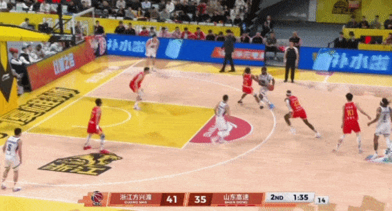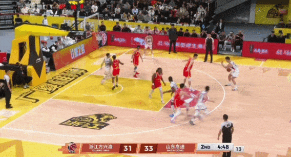 2、郭凯弧顶持球,于德豪和克里斯在弱侧跑Flare Screen,王证在强侧底角蹲坑,接球三分出手