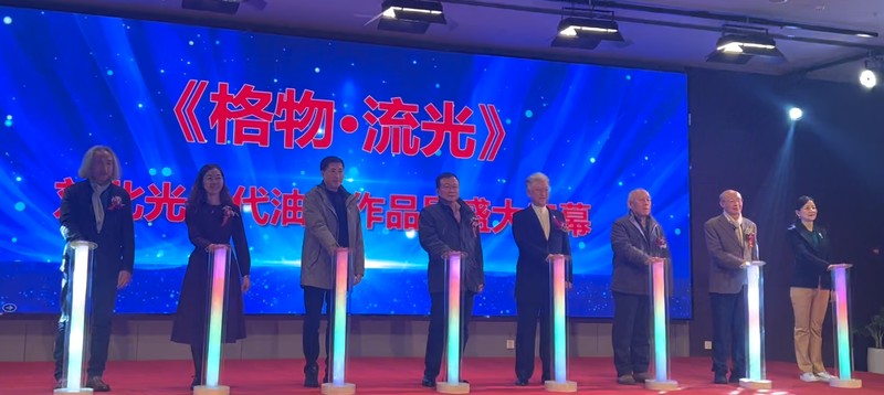 在全场期待中,展览启动仪式正式开启。顾伯平、陈建国、李文儒、熊澄宇、杨冬江、刘雪梅、朱敏、刘北光等嘉宾移步启动台,将右手置于启幕装置之上。伴随恢弘的启幕音乐与全场倒数 “五、四、三、二、一”,装置流光溢彩,音乐达到巅峰,主持人郑重宣布 “《格物・流光 —— 刘北光当代油画作品展》盛大启幕”,现场掌声如雷。启动嘉宾随后合影留念,定格这一历史性时刻,全场嘉宾也共同参与大合影,记录这场艺术盛会。