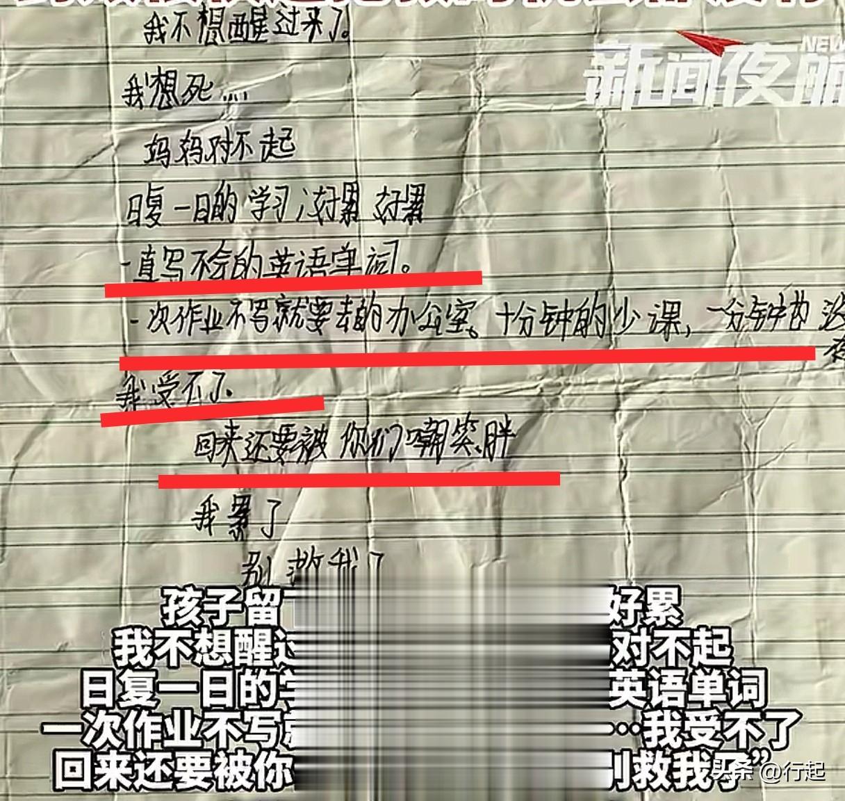 “我好累,我不想醒过来了,我想死,妈妈对不起,日复一日的学习,一直不会写的英语单词,一次作业不写就要去的办公室,我受不了,回来还要被你们嘲笑胖,我累了,别救我了。”