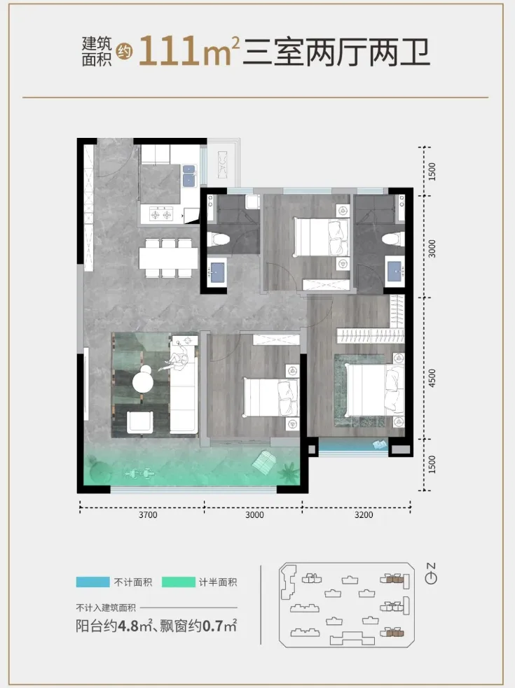 项目约111㎡户型,三室两厅两卫的设计。户型方正,没有面积浪费,三面朝南,采光不错。客厅阳台连通次卧阳台,阳台面宽更大。