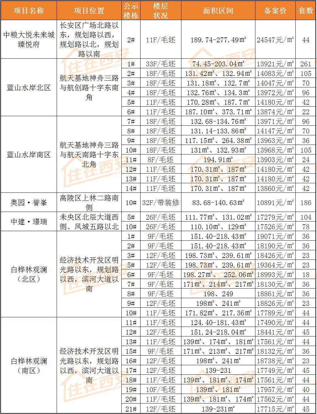 近日,西安5盘2150套房源公示一房一价。价格公示项目分别为:西部大道板块的中粮大悦未来城、航天城的蓝山水岸、徐家湾板块的中建·璟瑞、高铁新城的白桦林观澜、以及高陵的奥园·誉峯。