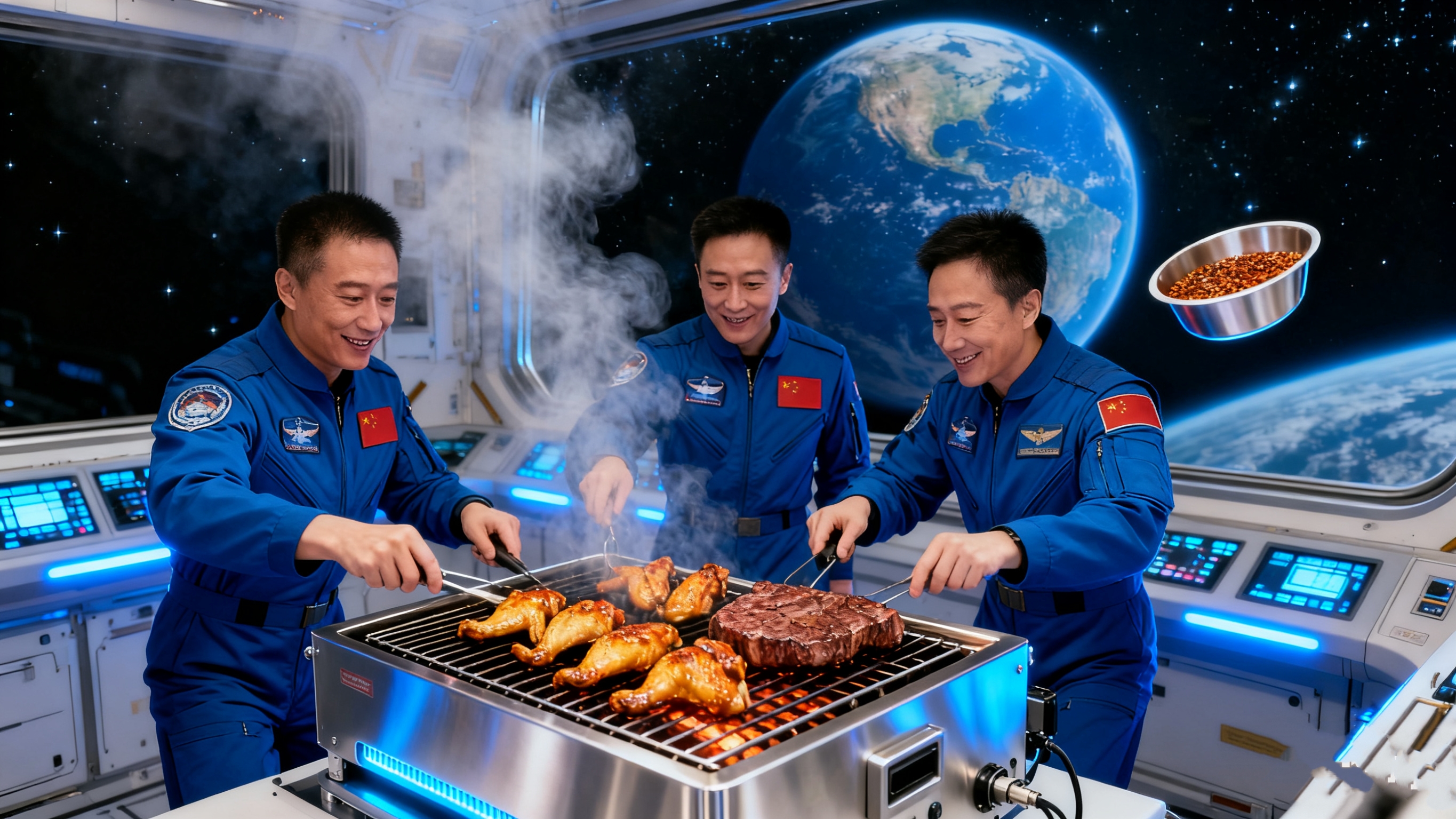 这不是科幻电影场景,而是神舟二十一号乘组的真实生活。天舟七号货运飞船秘密搭载的“太空烧烤神器”首次曝光:这款中国自主研发的热风烘烤设备,不仅能精准控制190℃火候,还靠内置的微重力油烟净化系统,让烤鸡翅滋滋冒油却不见一滴油污飘洒。视频里,航天员围坐“宇宙餐桌”,烤牛排的焦香透过镜头仿佛溢出屏幕,连带着烤玉米、烤红薯都成了“星际网红美食”,网友调侃“这哪是空间站,分明是太空大排档!