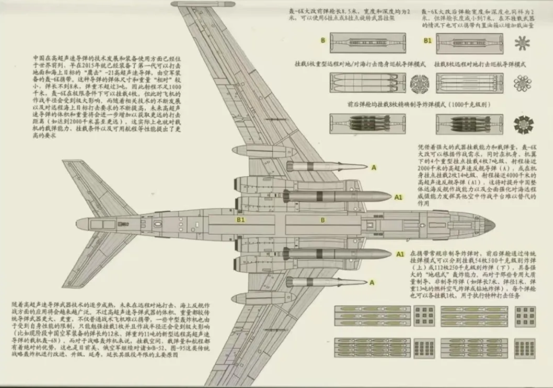四发驱动的“六爷”,能装载旋转挂架,携带挂12枚“空地(KD)”系列的远程巡航导弹,亦或者是在九三大阅兵中公开展示的“惊雷一号”空射高超音速导弹。
