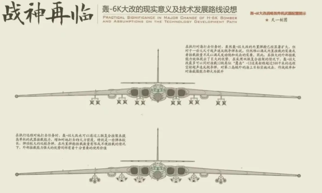 轰-6K(6个挂架)、轰-6N(轰-6K的空中受油版)和轰-6J(8个挂架),这三款最新的轰-6型号,都由原本冒着被对空防御系统击落的巨大风险临空投弹的轰炸机,蜕变为携带导弹进行远程攻击的“导弹载机”。