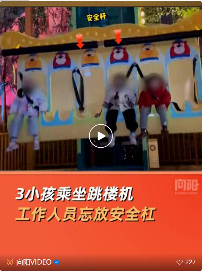 近日,一网友发布视频称,自己的女儿在四川资阳方特乘坐跳楼机时,跳楼机启动后座椅上的安全杠并未放下,孩子父亲发现后紧急喊工作人员停下跳楼机。