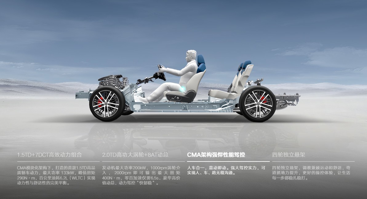 操控层面的舒适性同样出色,基于CMA线控底盘打造,配备四轮独立悬架与大直径防倾稳定杆,底盘调校兼顾运动与舒适。行驶在颠簸路面时,悬架能有效过滤震动,传递到车内的颠簸感大幅降低;过弯时车身侧倾小,转向精准,既保证了驾驶的乐趣,又让乘坐者倍感平稳。