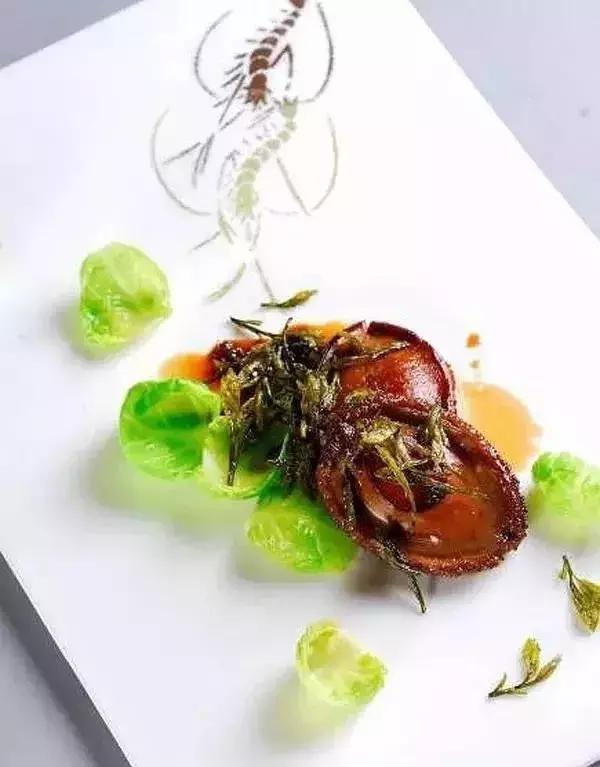 龙井香煎大连鲍原料:大连鲍10只,龙井茶叶20克,豹子头包菜20克,小米椒节少许。