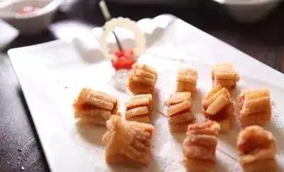 2、将猪面肉下入80度的油锅里,慢慢炸两分钟后,加大火力炸至金黄色,倒起装盘即可。