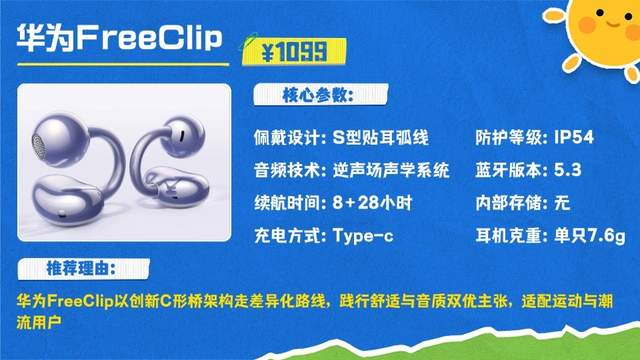 华为FreeClip以创新C形桥架构走出差异化路线,践行舒适与音质双优的产品主张,精准适配运动爱好者与潮流用户的使用需求。