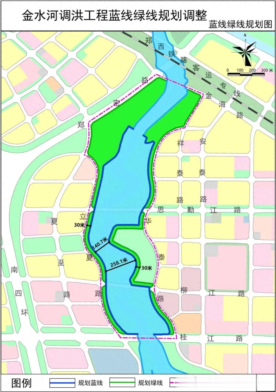 项目位于金水河上游,具体范围为郑密路、金海路、华泰路、桂江路、立夏路围合区域。项目2022年7月份获得二七区发改委批复(二七发改审批〔2022〕115号),项目代码为2207-410103-04-01-131221,最早公示水面范围较大,因为原规划范围内有特殊用地因素,后于2023年7月份对金水河调洪工程蓝线绿线规划进行了调整,就是水面减少,在河东岸增加了部分绿地,从而让调洪工程分为两部分,其中最大调蓄水面在思勤江路两侧,如下图。