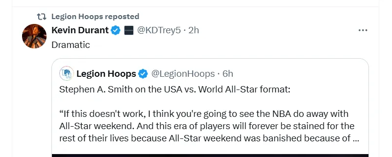 不过,A - 史密斯的这番言论很快便遭到了太阳球员杜兰特的驳斥。杜兰特在社交媒体上转发了 A - 史密斯关于全明星赛的言论,并简洁有力地评价道:“Dramatic(太夸张了/小题大做)。”熟悉杜兰特的球迷都知道,休赛期的他堪称“推特之王”,在网络世界中冲浪不停。他热衷于和球迷展开激烈对喷,时不时点赞美女动态,还喜欢转发评论各类时事,忙得不亦乐乎。此次他对 A - 史密斯言论的评论,从客观角度来看没有毛病。NBA 历经几十年的发展,全明星周末早已成为其不可或缺的重要组成部分,入选全明星对于球员而言是一项至高无上的荣誉,同时也能为 NBA 带来可观的收益和极高的曝光度。全明星周末所承载的,不仅仅是几场比赛那么简单,它更是一种文化、一种传统,是球迷与球员之间情感交流的重要纽带,怎么可能仅仅因为比赛看起来不够精彩就轻易取消呢?