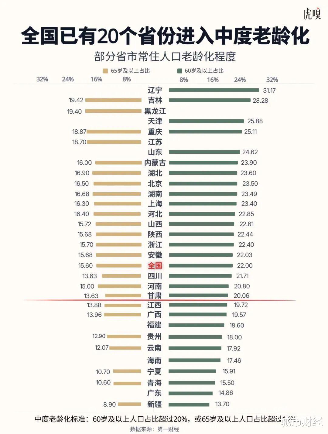 全国老龄化最严重的地区是东北,东北三省老龄化率位居全国前三,辽宁第一、吉林第二、黑龙江第三。
