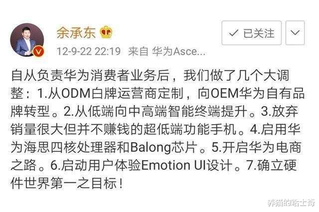 华为手机的发展必须要提一下2012年余承东发的微博,确立了华为消费者业务从ODM白牌运营商定制,向OEM华为自有品牌转型,从低端向中高端智能终端提升。