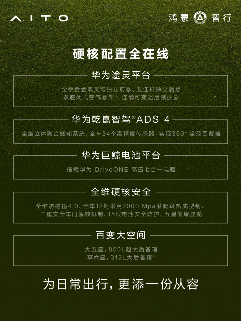 值得关注的是,全新问界M7增程长续航版悉数保留了在售车型的核心配置,硬核配置全面在线。华为途灵平台搭载全铝合金双叉臂独立前悬、五连杆独立后悬、双腔闭式空气悬架、连续可变阻尼减振器,兼顾舒适性与驾控质感;华为乾崑智驾ADS 4辅助驾驶系统配合34个感知硬件,可实现对动静态目标(含异形物体)的全场景和全天候感知,提升雨雾尘恶劣天气的安全性,以及对后向悬浮物、负向场景的识别,实现360度全覆盖;三电系统基于华为巨鲸电池平台打造,搭载华为DriveONE高压七合一电驱系统;全维防碰撞4.0显著提升行车安全,全天候守护用户驾乘全程。