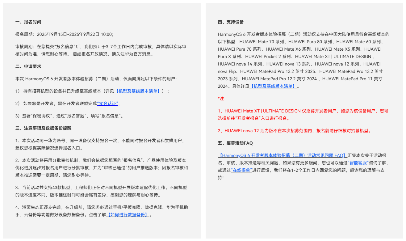 HarmonyOS 6 开发者版本体验招募(二期)活动仅支持在中国大陆使用且符合基线版本的以下机型:HUAWEI Mate 70 系列、HUAWEI Pura 80 系列、HUAWEI Mate 60 系列、HUAWEI Pura 70 系列、HUAWEI Mate X6 系列、HUAWEI Mate X5 系列、HUAWEI Pura X 系列、HUAWEI Pocket 2 系列、HUAWEI Mate XT | ULTIMATE DESIGN 、HUAWEI nova 14 系列、HUAWEI nova 13 系列、HUAWEI nova 12 系列、HUAWEI nova Flip、HUAWEI MatePad Pro 13.2 英寸 2025、HUAWEI MatePad Pro 13.2 英寸 2023 系列、HUAWEI MatePad Pro 12.2 英寸 2024 、HUAWEI MatePad Pro 11 英寸 2024。