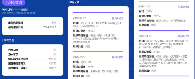维保记录是 4S 店 / 正规维修厂的官方电子档案,与车架号终身绑定,全国联网、加密存储、无法篡改,记录了车辆从出厂到现在的所有核心信息: