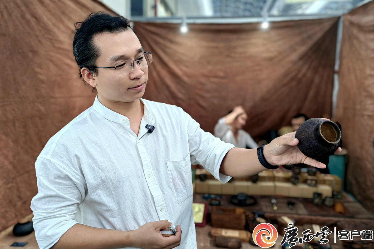 桂林漆器传承人劳传胜向观众介绍柚罐。