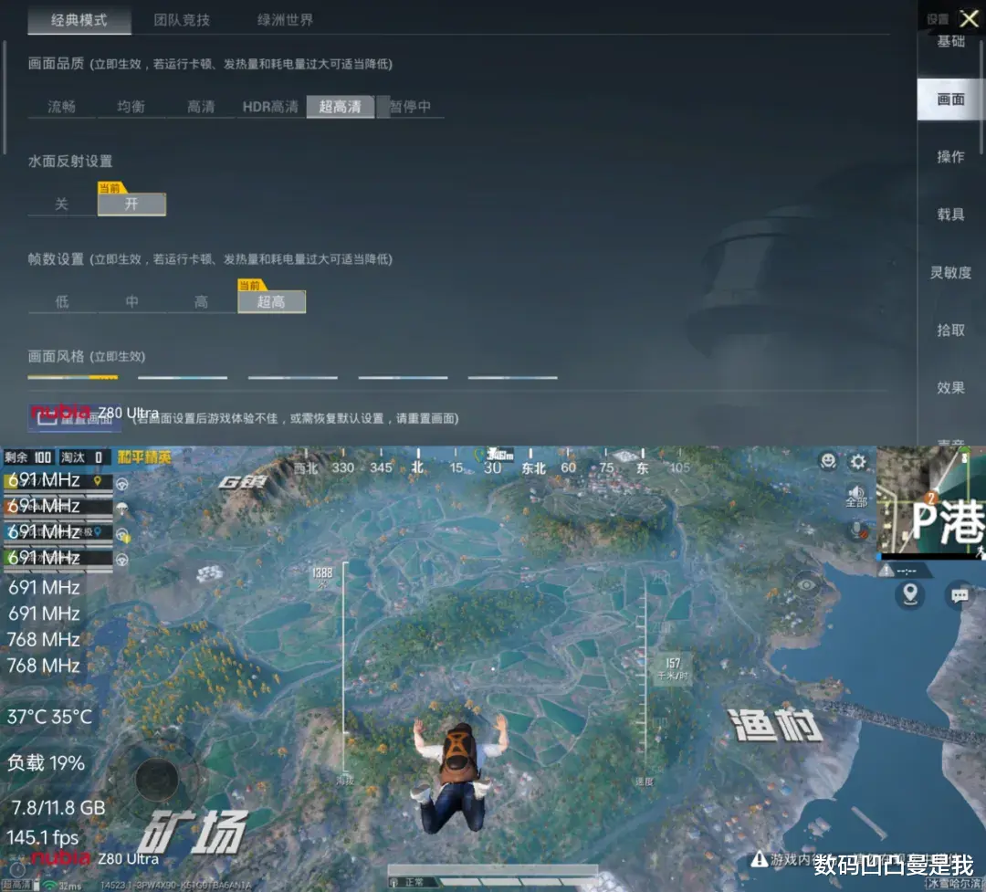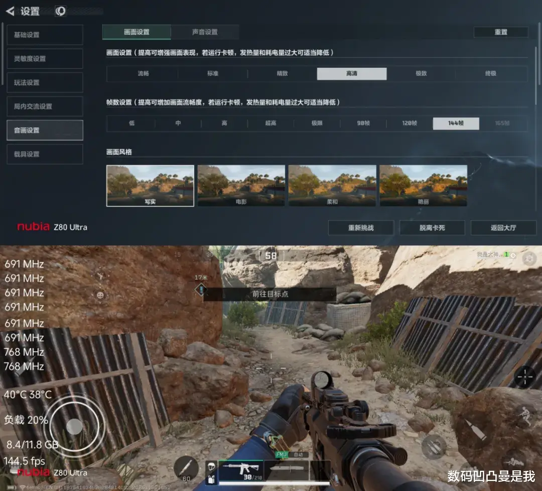 锁定最高帧率后,在努比亚Z80 Ultra上玩《三角洲行动》,高清画质下可以稳定144帧,极致画质系统显示最高选项为90帧,实际可达144帧,画面流畅。