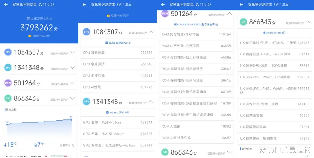 手机性能测试,安兔兔算是比较权威的,我这台努比亚Z80 Ultra是12GB+512GB款,安兔兔整机跑分为379.3262万,在数据库中超越94%的用户,另外CPU和GPU得分分别为108.4307万、134.1348万,属于前10%的存在。