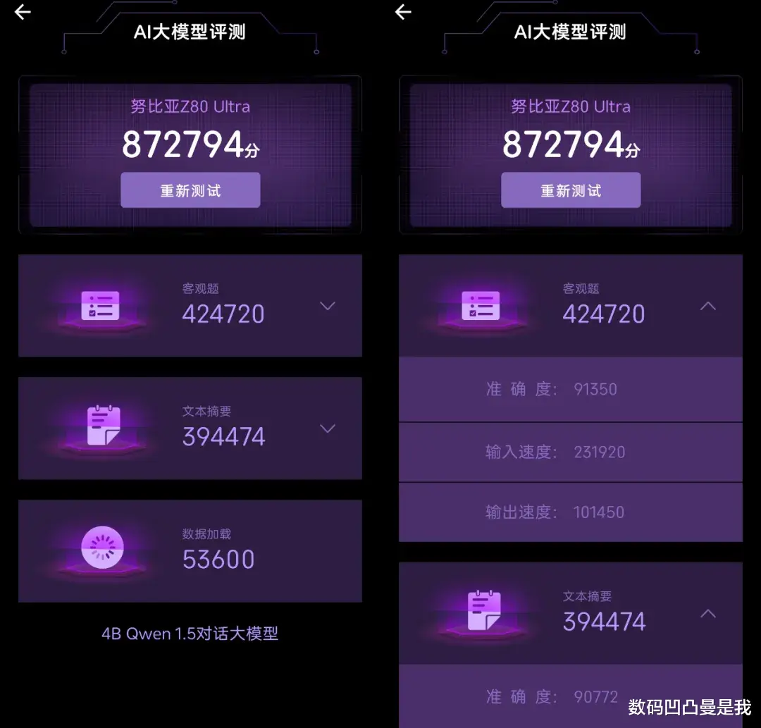 前面也说了,第五代骁龙8至尊版移动平台的AI性能表现也是一大亮点,所以顺便也用安兔兔做个AI大模型评测。结果显示整机得分为87.2794万,客观题、文本摘要、数据加载分别为42.4720万、39.4474万、5.36万。