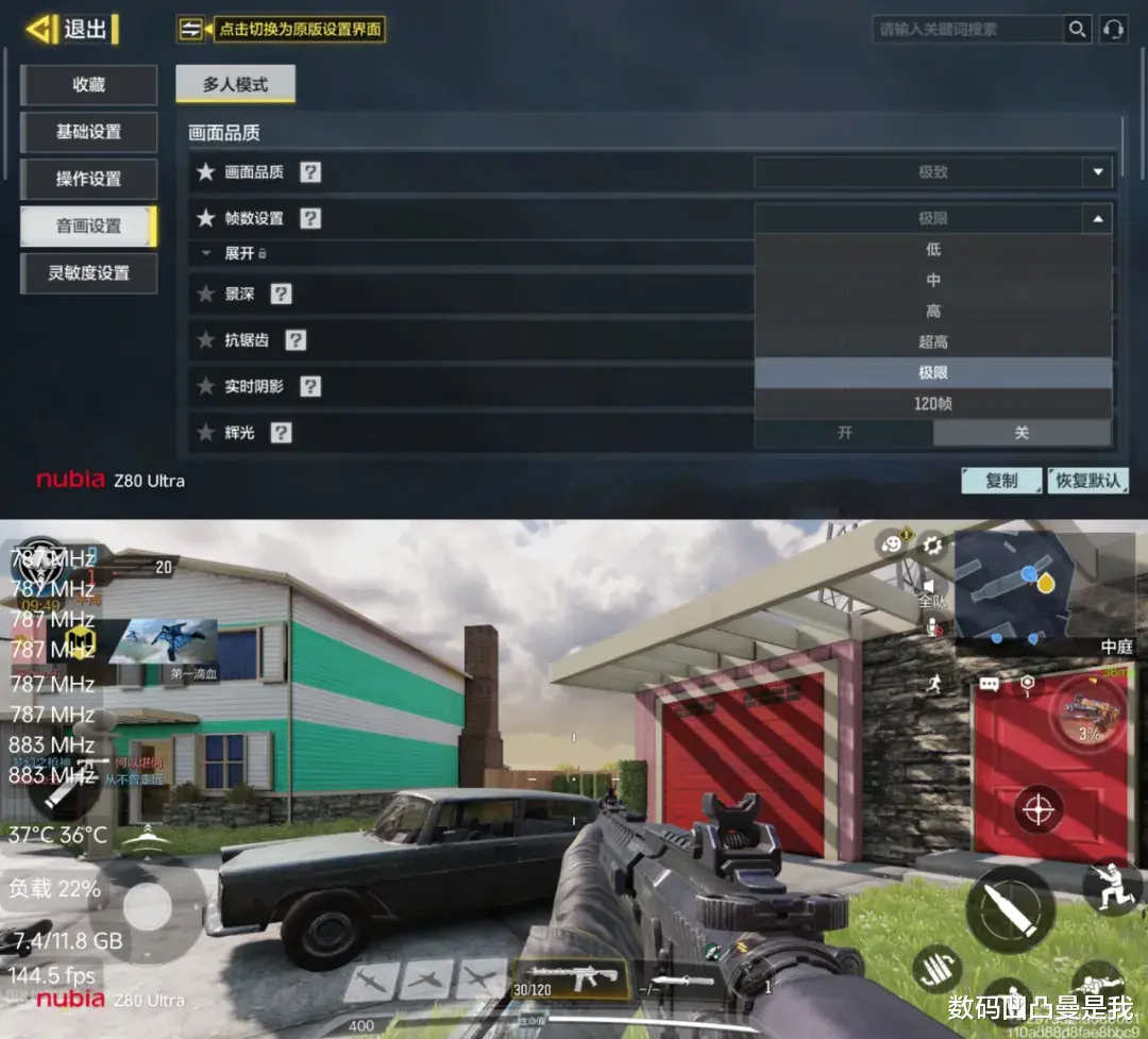 《使命召唤》音画设置,画面品质选择极致,帧数最高只能选极限,但在实际游戏场景中的监控帧数和《和平精英》一样,还是保持在144帧。