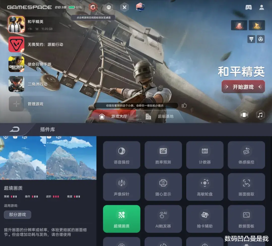 如果玩游戏的频率比较高,努比亚自带的游戏空间也提供了非常多的插件选择,比如语言操控、胜率预测、超境画质等,这些功能还挺实用的。