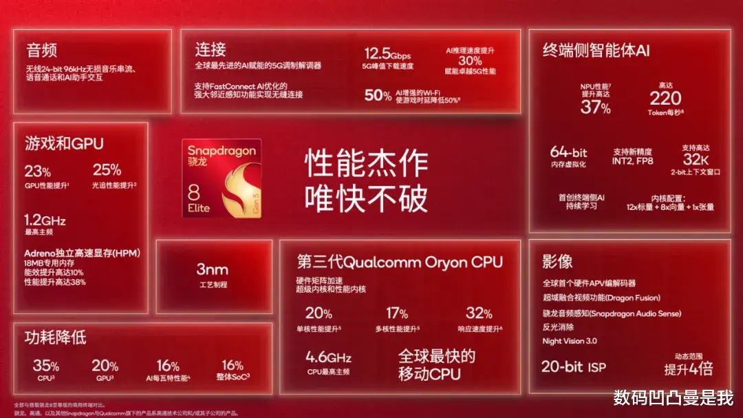 说实话,骁龙芯片性能进化还挺快的,尤其是第五代骁龙8至尊版,全新高通Oryon™CPU刷新“世界最快手机CPU”纪录,号称是目前全球最快的移动SoC,可以为各家的安卓旗舰机提供强劲的性能支持,在续航、影像、游戏、信号等各方面几乎都没有短板。