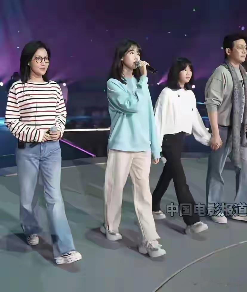 表演现场,陆毅一家四口手牵手缓缓走上舞台,瞬间引发全场尖叫。14岁的贝儿身高已逼近父亲陆毅(官方身高182cm),一双逆天长腿笔直修长,白色纱裙下若隐若现的脚踝更显优雅。而10岁的小叶子虽年纪尚小,但腿长比例已十分惊人,与姐姐站在一起宛如“复制粘贴”。鲍蕾虽身高168cm,但身材比例极佳,与陆毅并肩时气场丝毫不输,一家四口站在一起宛如时尚大片。