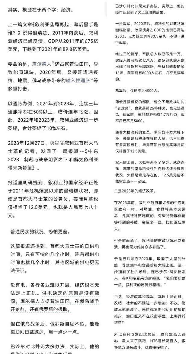 除了以上这些,相信很多人很想知道巴沙尔的政府为什么这么快溃败,大家可以去看看卢克文的最新文章,从经济,政治多方面分析,下面是一小段,大家可以看看!
