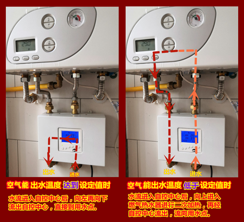 若空气能水箱出水温度未达标,自控中心会自动切换水流方向,将水送入燃气热水器进行二次加热,待水温符合要求后,再输送至用水点,保证出水温度稳定。