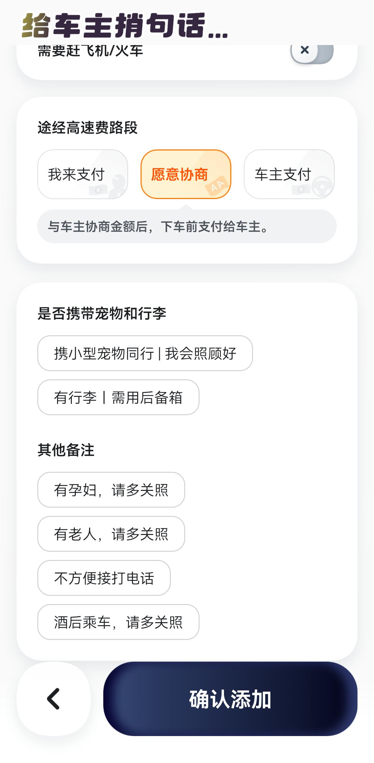 乘客设置好高速费分摊方式,车主接单即表明接受该分摊方式;车主乘客可通过IM消息功能充分协商好路线、上车点和时间等事宜,让合乘更顺畅。