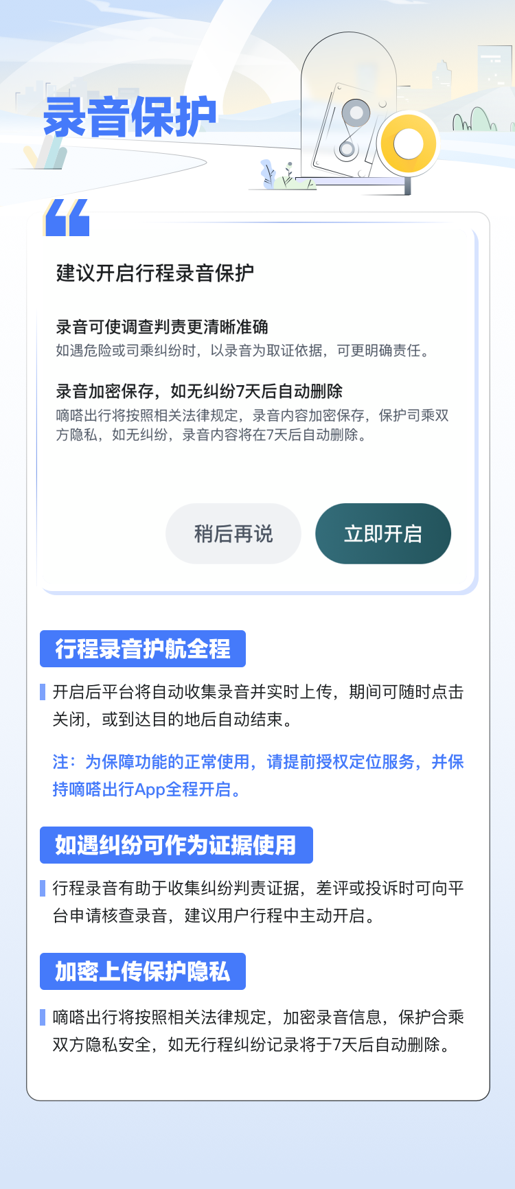 在合乘途中,嘀嗒出行建议同路人礼貌交谈,相互尊重,包容互谅,全程开启“行程录音保护”功能,多一分安心。