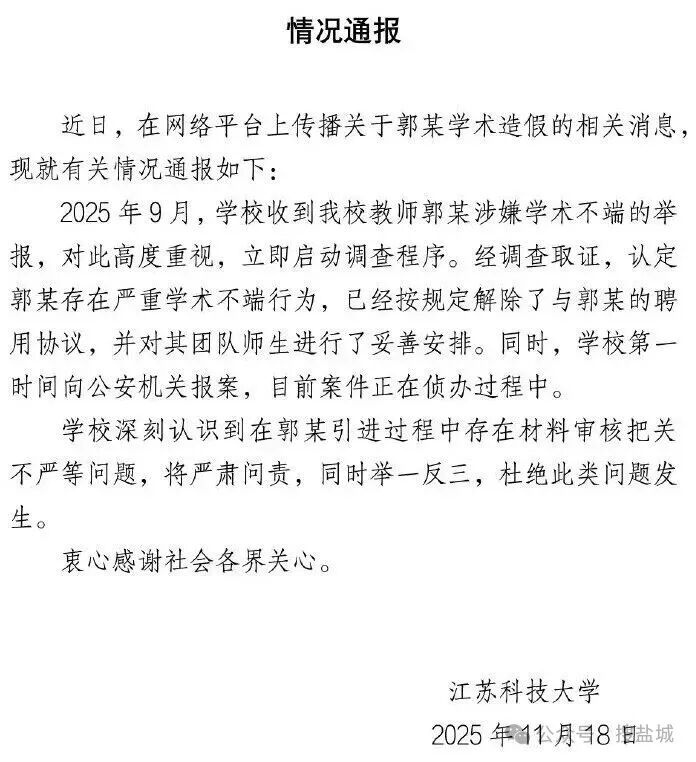 近日,江苏科技大学教授、博士生导师郭某因涉嫌学术造假、侵占国家科研经费等严重问题,成为社会关注焦点。11月18日,该校通过官方微博发布情况通报,确认郭某存在严重学术不端行为,并已采取一系列处置措施,事件的后续走向与校方反思引发广泛讨论。