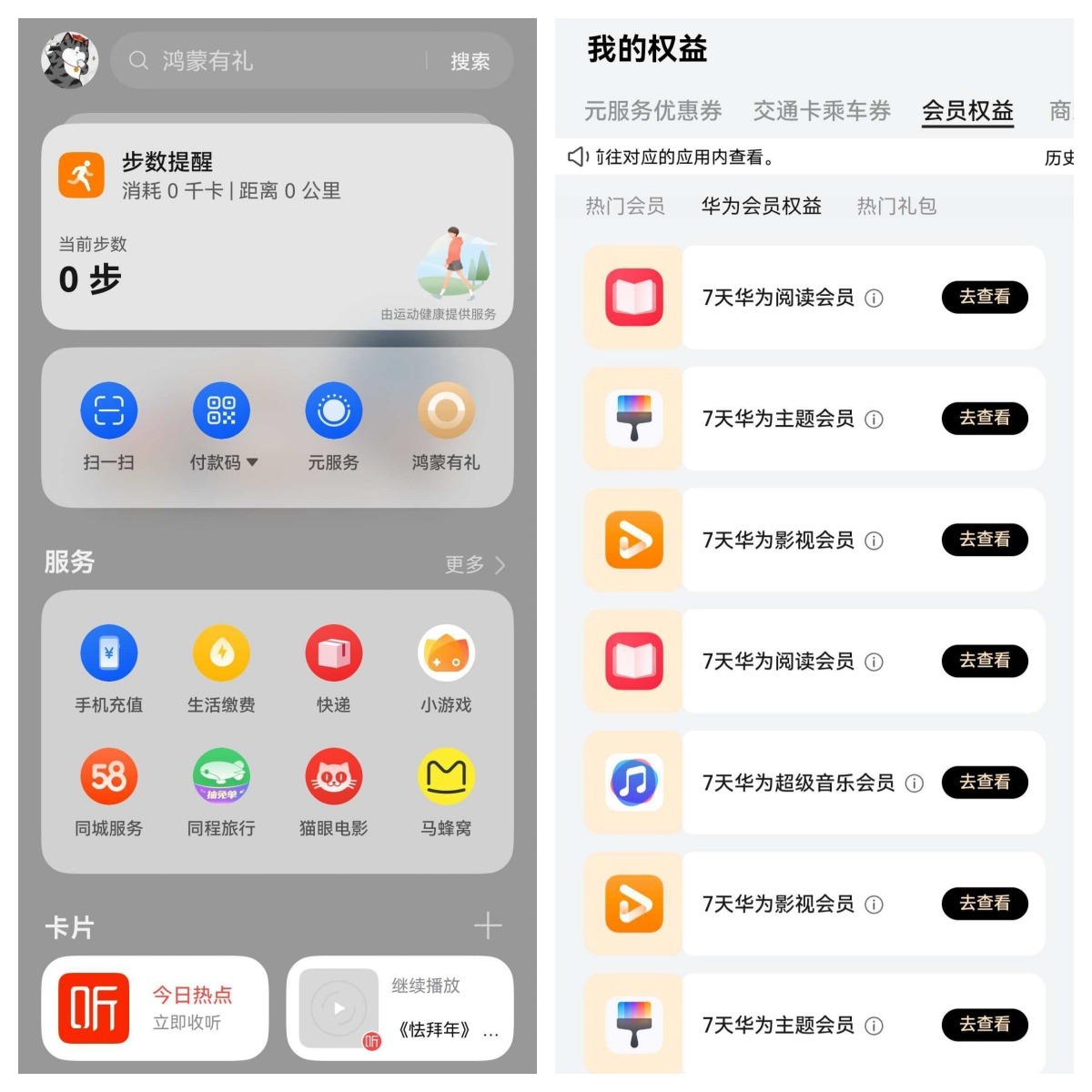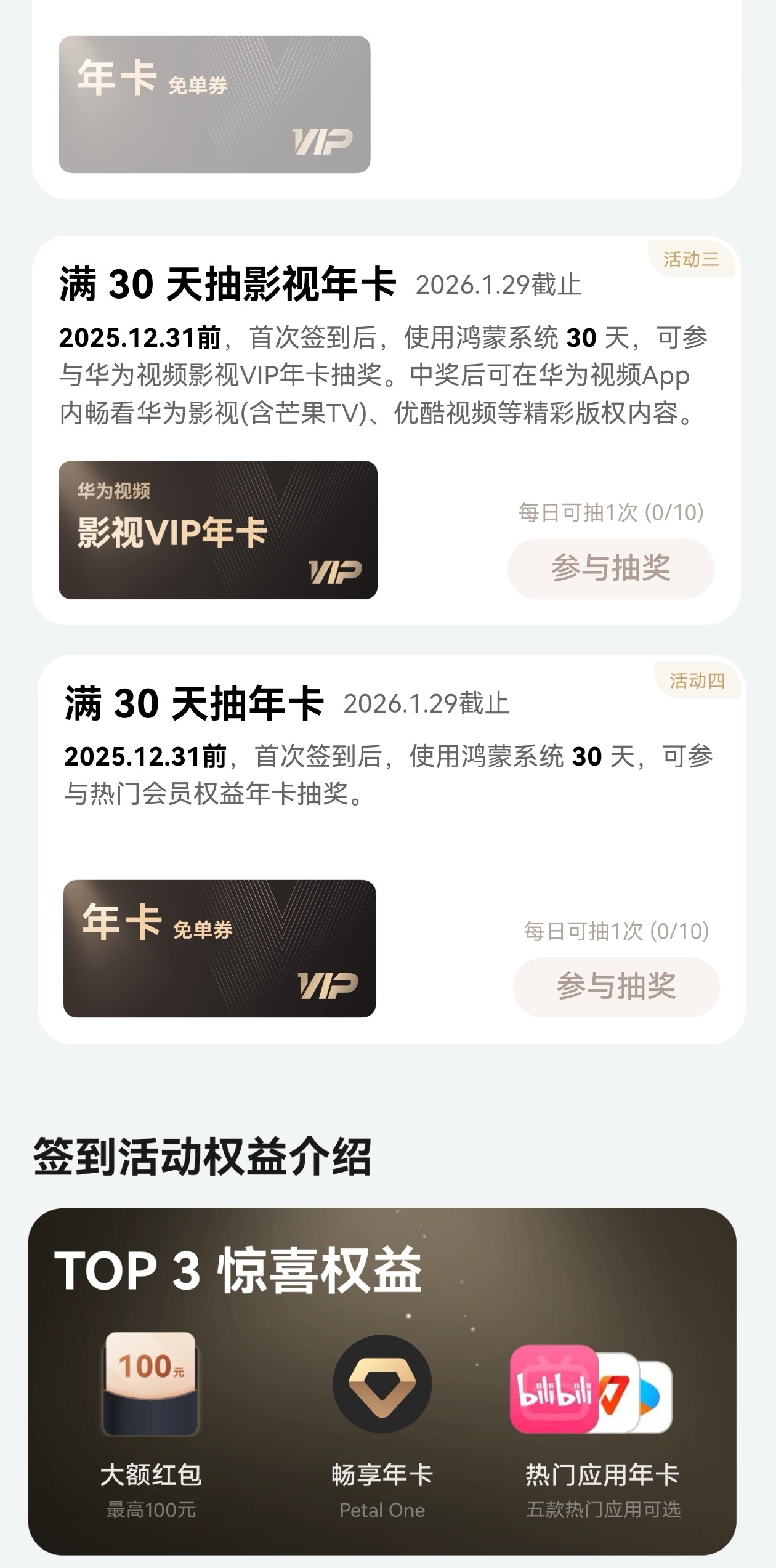 几天下来已经养成了签到习惯,每天签到都有随机红包和权益,还有音乐会员、月卡免单券、元服务优惠券等等,跟开盲盒似的,天天有新惊喜。而且首次签到第30 天后不但可以抽影视年卡大礼包,华为视频、优酷会员全包含,这不妥妥的冬日宅家精神食粮储备库嘛,还可以抽热门应用年卡,b站、优酷视频、芒果TV、喜马拉雅和WPS会员五选一,不管是刷番、听播客还是办公,总有一款用得上。