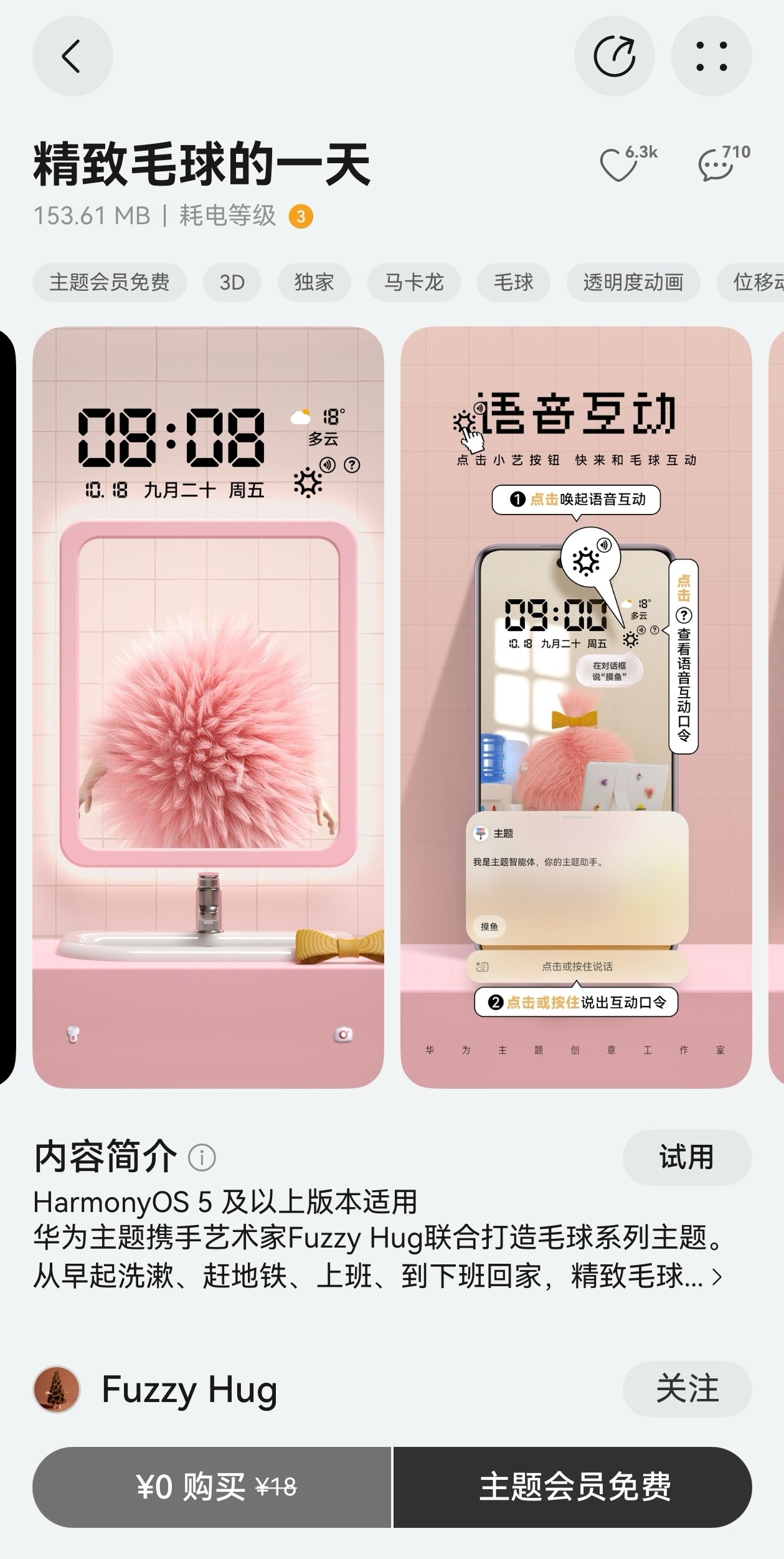 说起来,心血来潮打开华为主题,还是因为前段时间鸿蒙6发布会的毛球主题刷屏全网,我顺道去华为主题“寻宝”,刷到了一个“给手机穿件毛衣”的专题,简直是为降温天量身定做的。专题里上线了《精致毛球的一天》《毛绒腊肠小狗》和《卡皮巴拉 毛绒豚豚》等毛绒主题,毛茸茸的视觉看着就暖和了。
