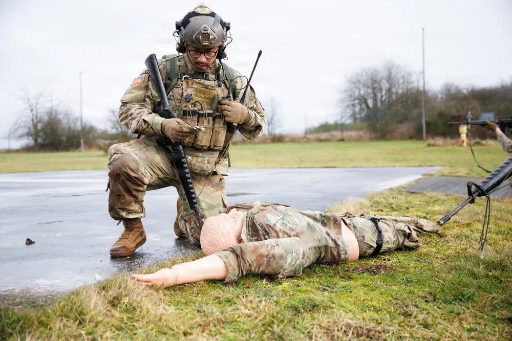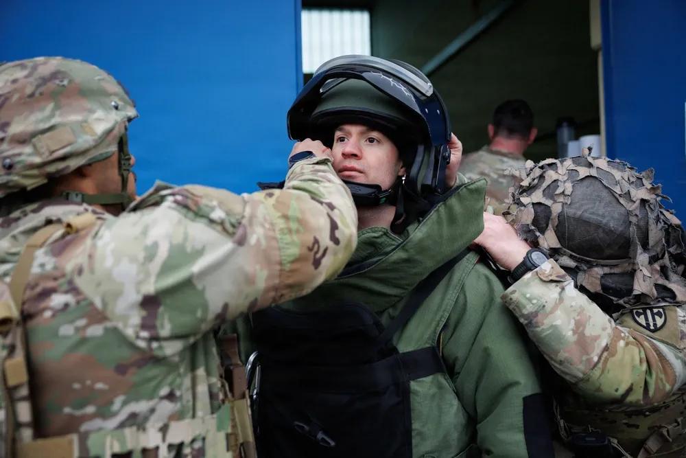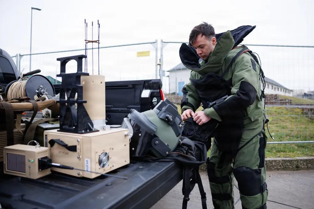 2026年1月14日,美国第18军事警察旅第720军械连的爆炸物处理技术员,穿戴爆炸物处理服进行训练,为情境训练演习中临时爆炸装置通道做准备,地点:美国陆军军营,鲍姆霍尔德,德国,。情境训练演习为士兵提供实际场景,帮助他们保持、发展和进一步训练技能。