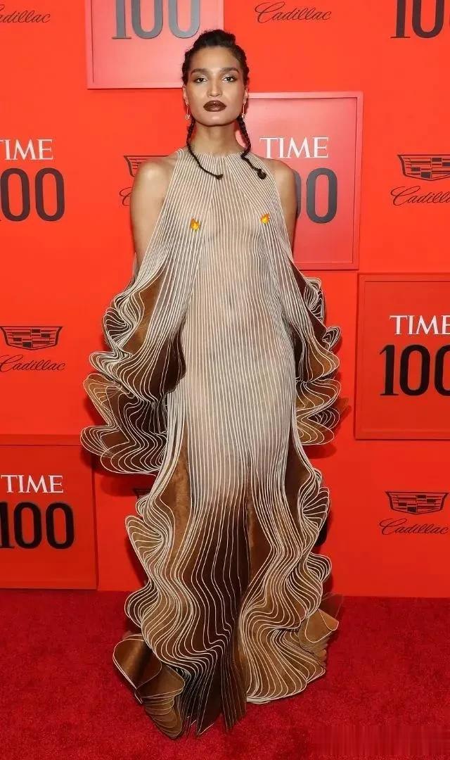 造型明星 Indya Moore 穿着这件带有标志性漩涡设计的米色和棕色 Iris Van Herpen 礼服,看起来就像一场梦。