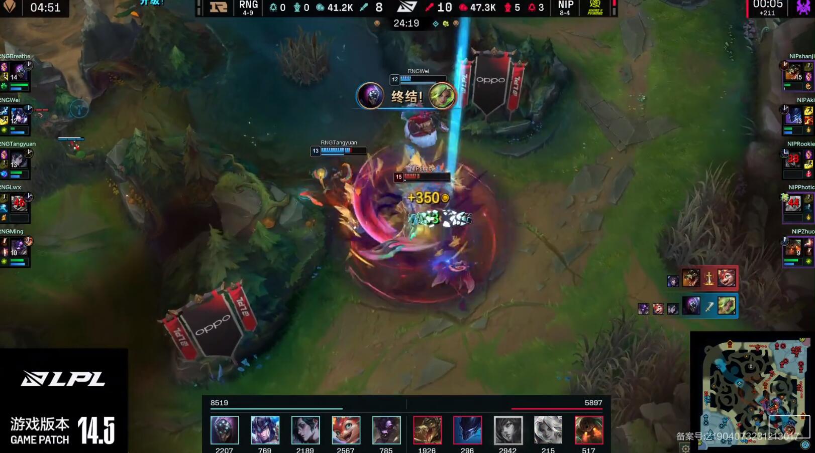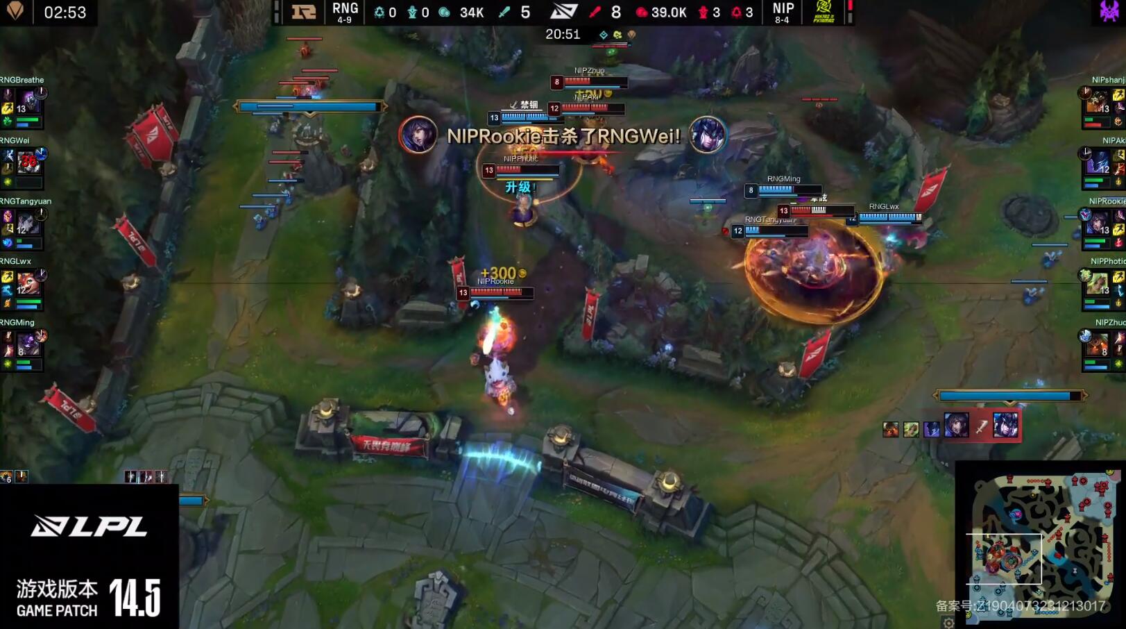 16分半RNG上路尝试推进二塔被NIP支援包抄打出0换3,金克斯再提两颗人头,几乎已经宣告了RNG的崩盘。