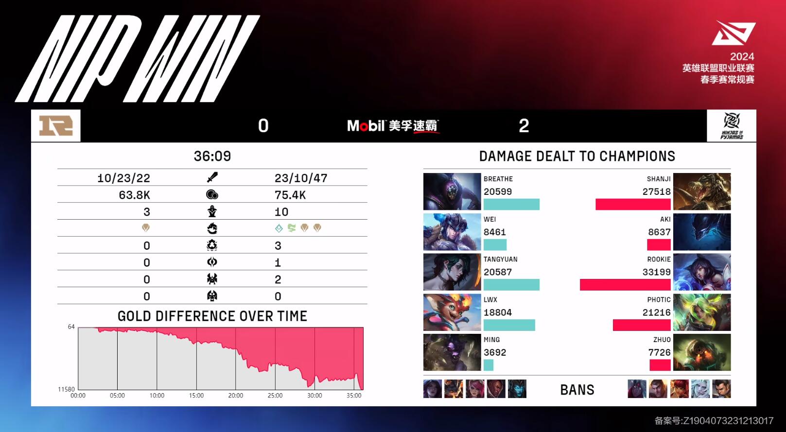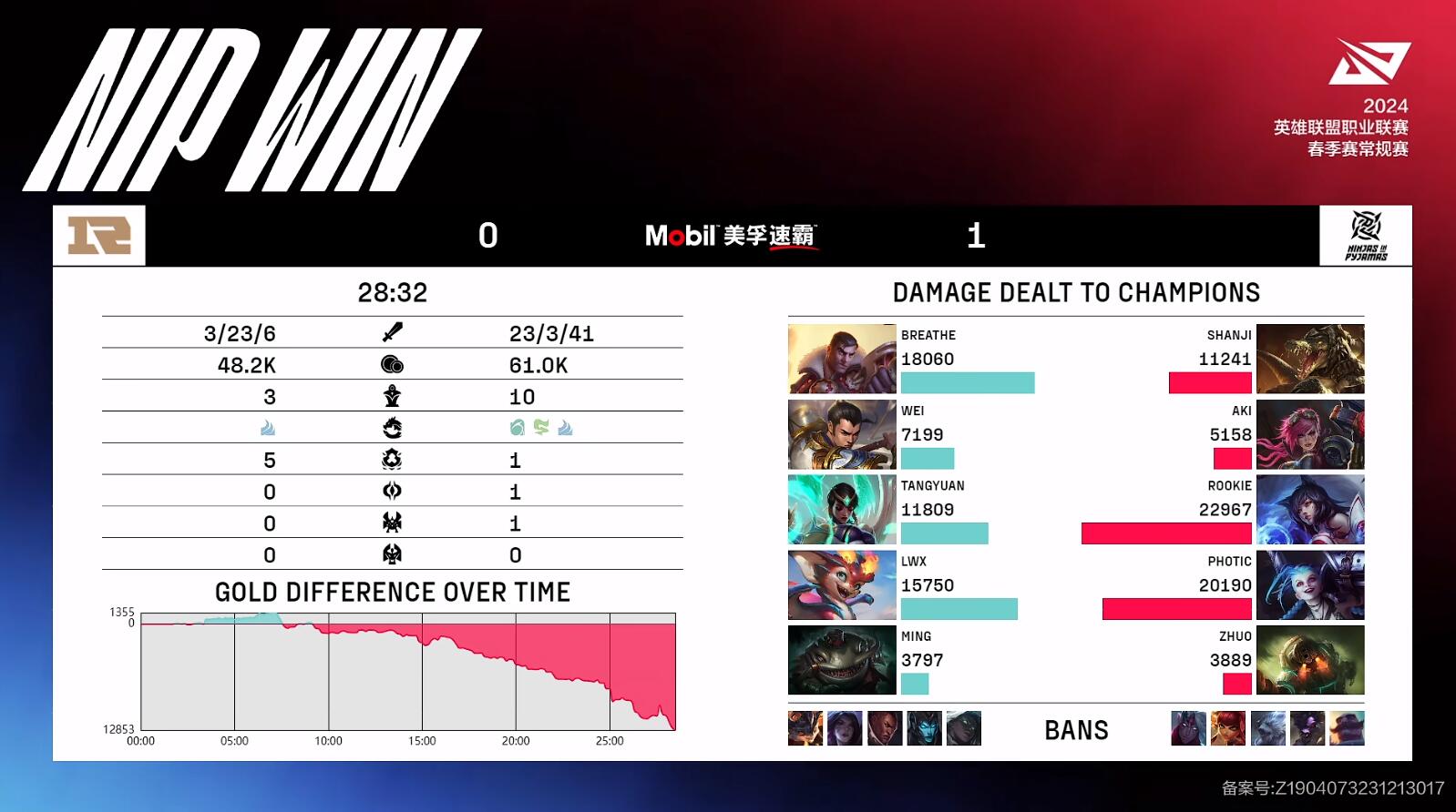 不过在巨大的经济差面前,RNG还是难以依靠小火龙完成翻盘,遭到了NIP横扫。