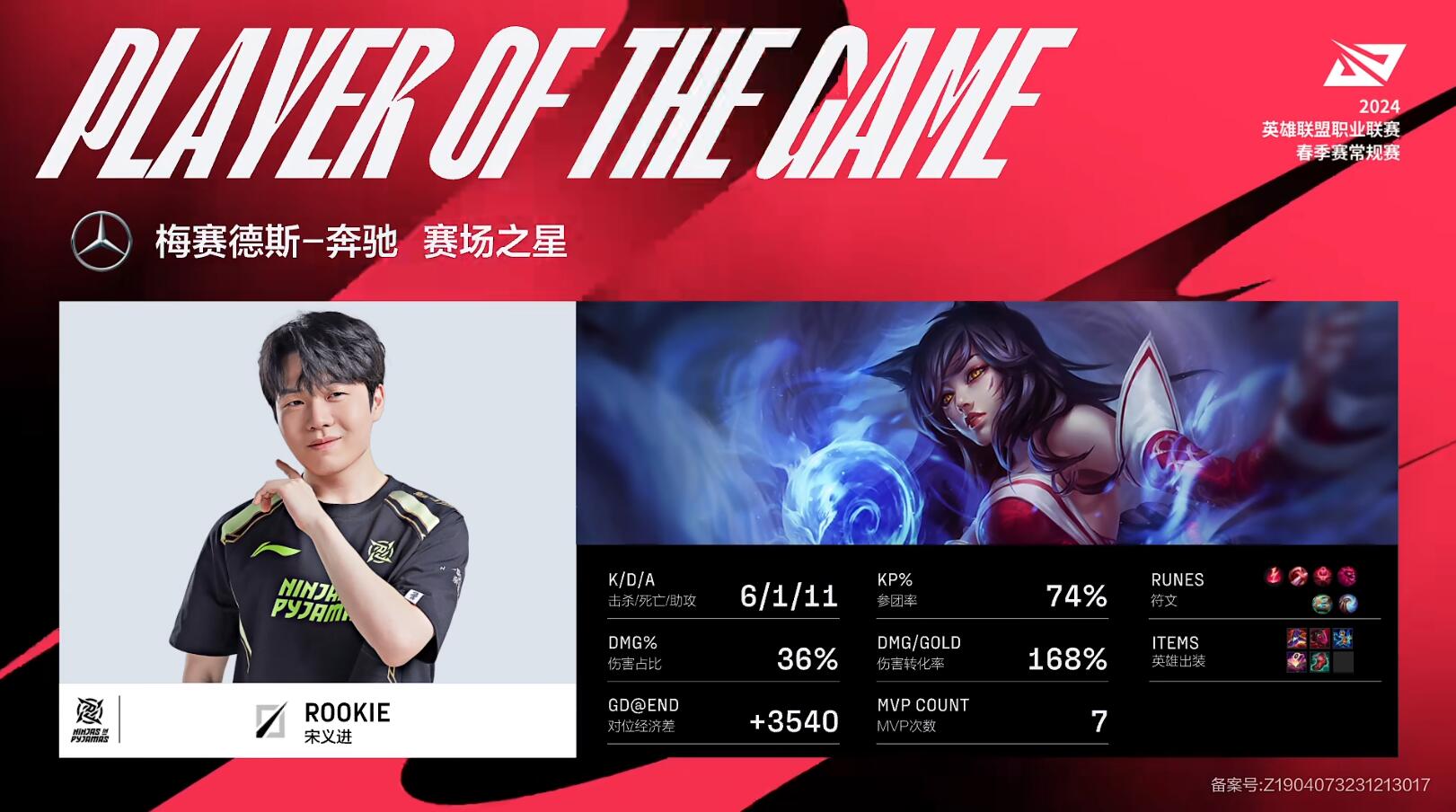 最终比赛在金克斯的无限超神中结束,人头比来到23比3,NIP一边倒的屠杀,赛后数据,Rookie打出全场最高输出,接连支援上路粉碎了RNG想依靠杰斯撑中期局面的计划。