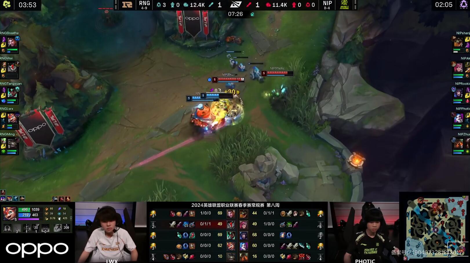 前期打得比较混乱,圆神早早启动送出一血,随后的乱斗RNG取得1换2小赚一点,整体局面NIP小优。