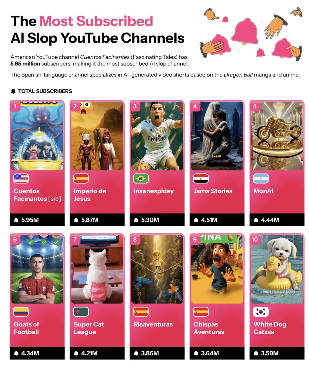 再扎心点说就是,我们平时在YouTube刷到的每5条视频中,可能有1条就是AI随手糊出来的。(不活了.jpg)