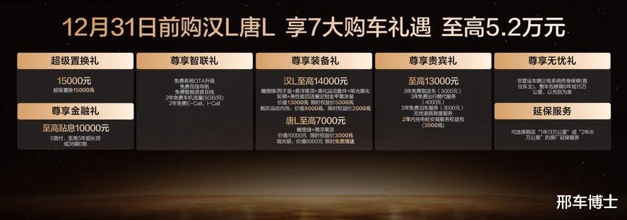 此次,汉L EV 3款车型,超级置换补贴后售价20.48万~26.48万元;汉L DM 3款车型,超级置换补贴后售价19.48万~24.48万元;唐L EV 3款车型,超级置换补贴后售价22.48万~27.48万元;唐L DM 3款车型,超级置换补贴后售价21.48万~27.08万元。同时,比亚迪还为用户准备了包含置换补贴在内的至高价值5.2万元(汉L)/4.5万元(唐L)尊享礼遇。(以上权益截至12月31日)