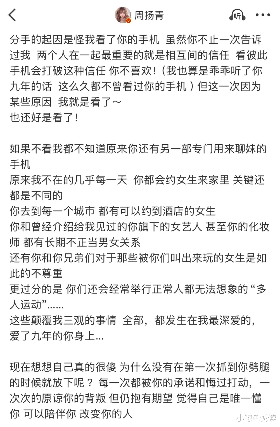周扬青用9年的时间陪伴了一个感情的不忠者。