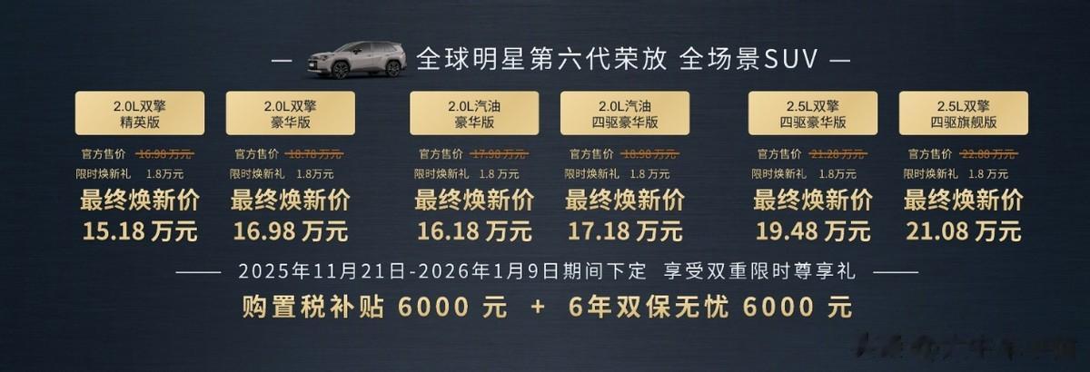 以上一代风尚PLUS2.0汽油版为例,售价为19.98万元;与之对应的全新荣放2.0L双擎豪华版,产品力大幅提升1.5万元,但定价却拉低1.2万元,较上一代产品综合价值提升接近2.7万元,官方售价为18.78万元。如在尊享预定期下定,叠加现金直给1.8万元的限时预定福利,最终焕新价低至16.98万元。在此基础上,还可享受6000元的购置税补贴以及价值6000元售后权益。